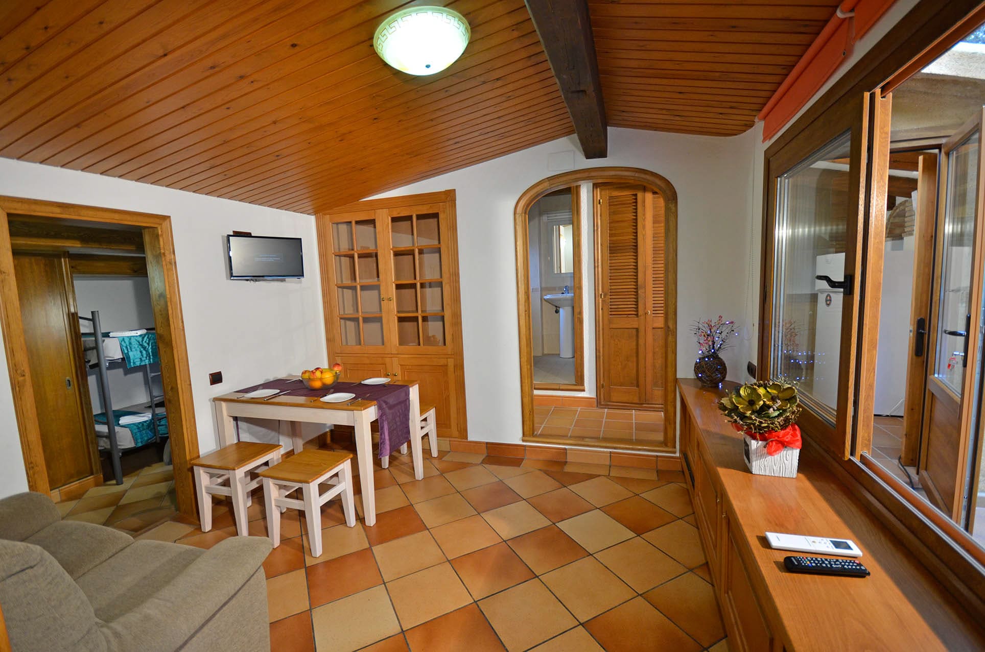 Habitacions: una habitació amb llit de matrimoni (160 x 200) una altra habitació amb llitera (90 x 190) i llit supletori (90 x 190), armaris i penjadors, mantes i llençols (canvi cada 5 dies).