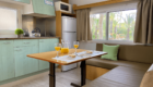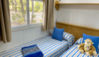 Our COTÊ D’AZUR bungalows have a complete living-dining room, a bathroom with a shower, a kitchen with a ceramic hob, etc… Two double bedrooms: one with a double bed and the other with two single beds, a terrace integrated into the same bungalow with Built-in barbecue and granite marble water sink. It is ideal for a maximum of 4 people.